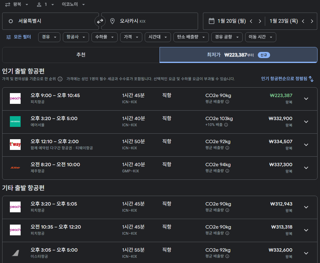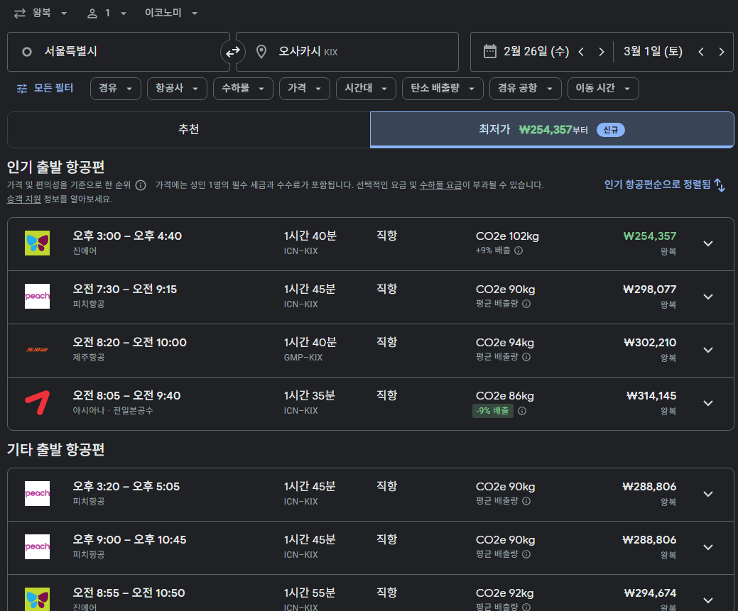 최저가는 더 저렴하지만 시간대가 좋지 않습니다. 나머지 항공권들은 오히려 더 비싼 가격을 형성하고 있습니다.