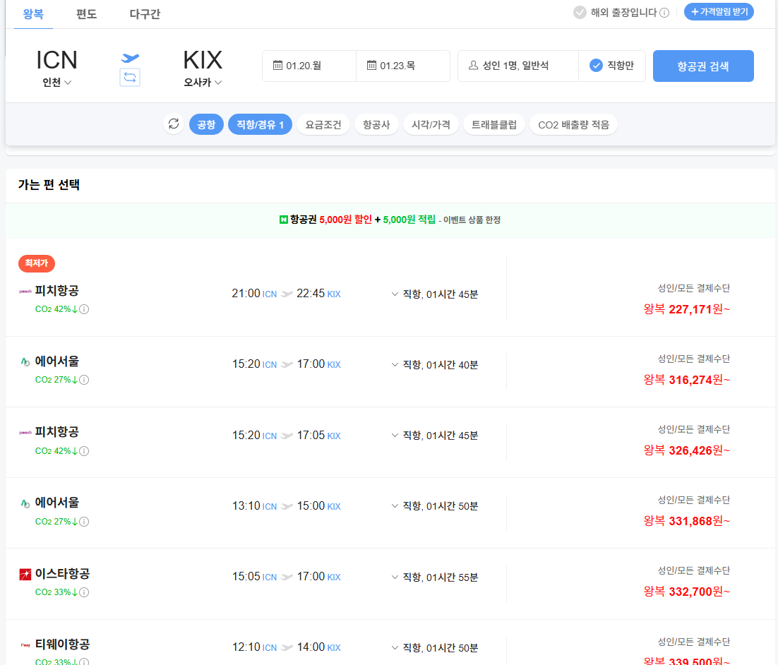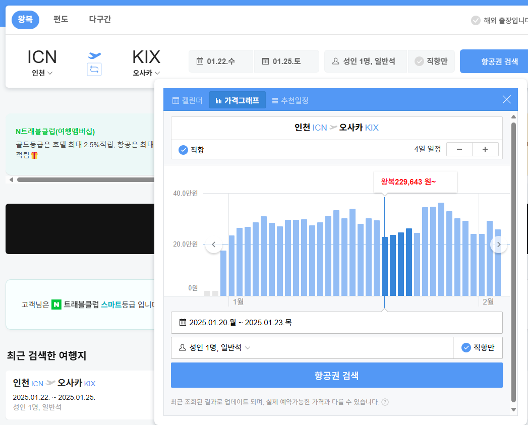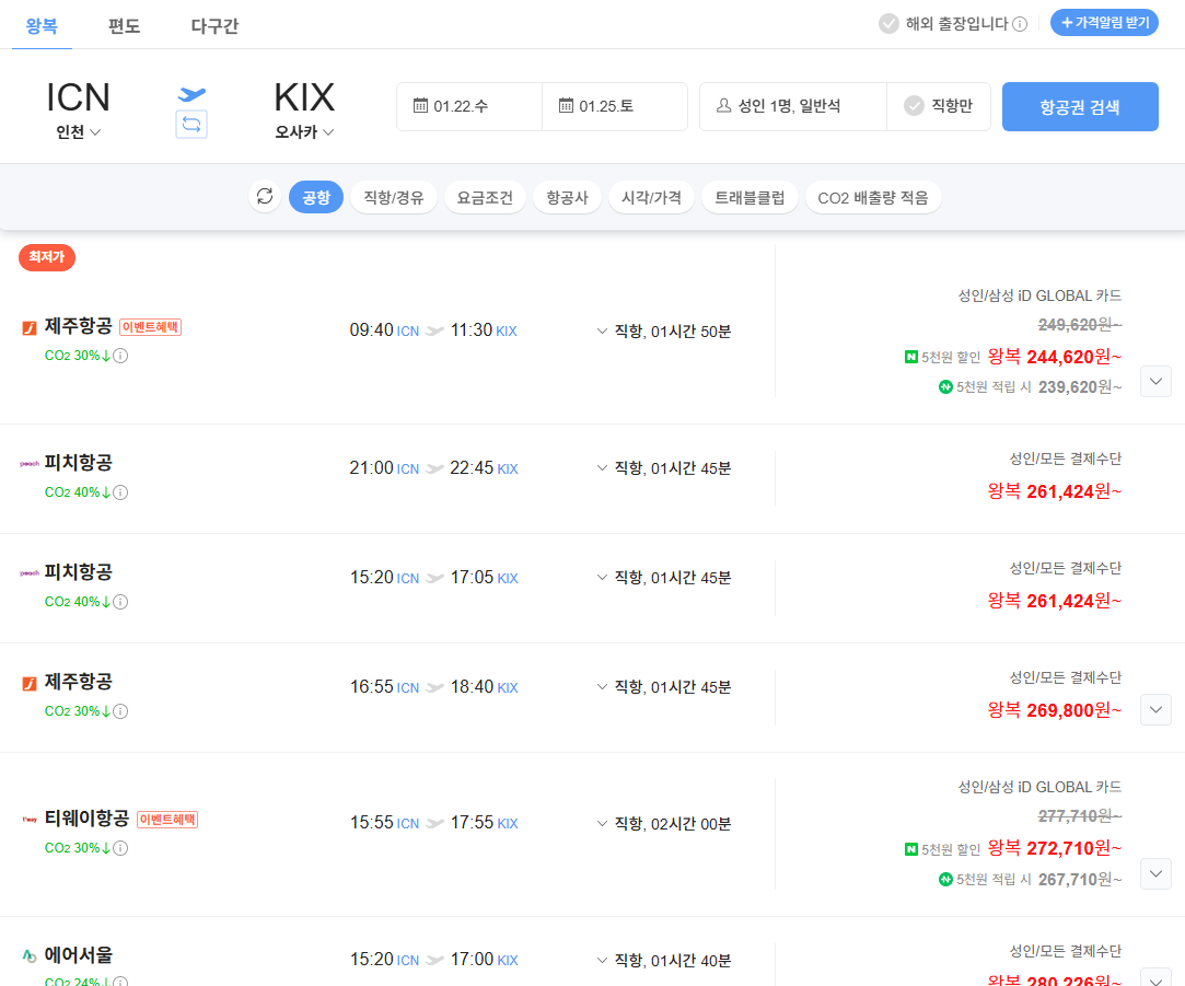 똑같이 목적지는 오사카, 날짜는 1월 22일 부터 25일로 설정하고 조회해보겠습니다.