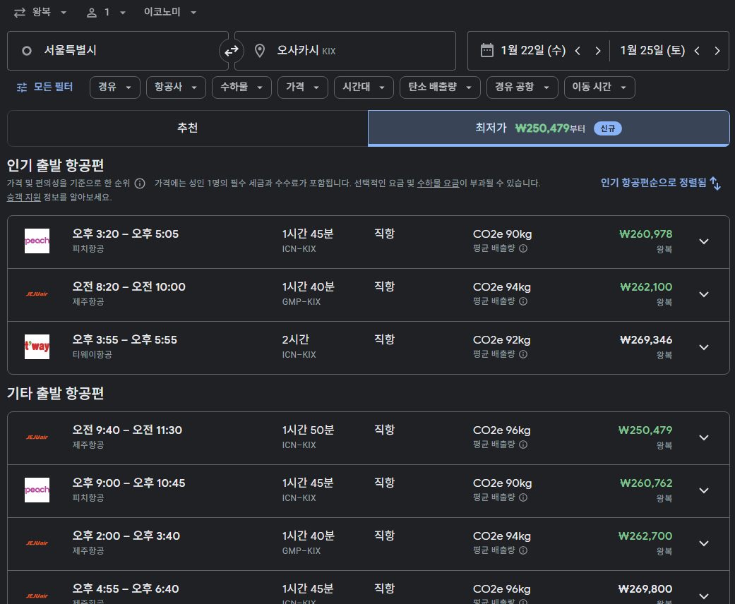 1월 22일에 오사카로 가는 왕복 항공권 가격은 약 20만원대 중후반에서 형성되어 있는 것을 확인할 수 있습니다. 이 방법을 활용하면 가장 저렴한 시기와 요일을 찾아서 가성비로 여행을 준비할 수 있겠습니다.
